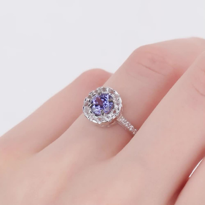 Кольцо с 10 бриллиантами природными, 0.1 карат, огранка круг 57 граней, цвет 3, чистота 6, тип огранки А; 1 танзанитом природным, 0.82 карат; 12 сапфирами бесцветными природными, 0.52 карат; Белое золото 585 пробы.