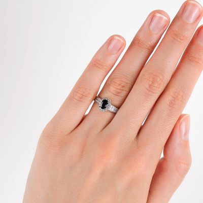 Кольцо с 1 сапфиром, 0.56 карат, цвет 3, чистота 3, тип огранки Б; 26 бриллиантами, 0.26 карат, огранка круг 57 граней, цвет 3, чистота 6, тип огранки А; 12 бриллиантами, 0.05 карат, огранка круг 17 граней, цвет 2, чистота 2, тип огранки А; Белое золото 585 пробы.