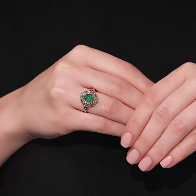 Кольцо с 4 бриллиантами природными, 0.22 карат, огранка круг 57 граней, цвет 3, чистота 6, тип огранки А; 2 бриллиантами природными, 0.02 карат, огранка круг 57 граней, цвет 3, чистота 6, тип огранки А; 8 бриллиантами природными, 0.05 карат, огранка круг 57 граней, цвет 3, чистота 6, тип огранки А; 1 изумрудом природным, 1.11 карат, цвет 3, чистота 3, тип огранки Б; Желтое золото 585 пробы.