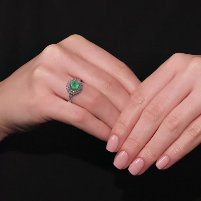 Кольцо с 10 бриллиантами природными, 0.23 карат, огранка круг 57 граней, цвет 3, чистота 6, тип огранки А; 36 бриллиантами природными, 0.41 карат, огранка круг 57 граней, цвет 3, чистота 6, тип огранки А; 1 изумрудом природным, 0.76 карат, цвет 3, чистота 3, тип огранки В; Белое золото 585 пробы.