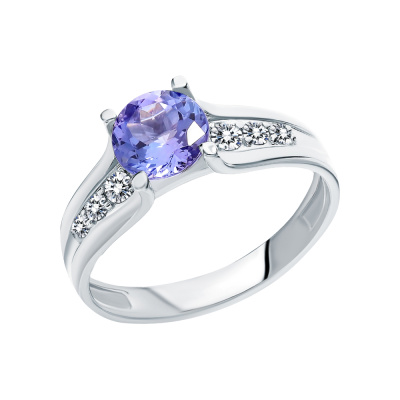 Кольцо с 2 бриллиантами природными, 0.06 карат, огранка круг 57 граней, цвет 4, чистота 5, тип огранки А; 2 бриллиантами природными, 0.04 карат, огранка круг 57 граней, цвет 4, чистота 5, тип огранки А; 2 бриллиантами природными, 0.03 карат, огранка круг 57 граней, цвет 4, чистота 5, тип огранки А; 1 танзанитом природным, 0.85 карат; Белое золото 585 пробы.