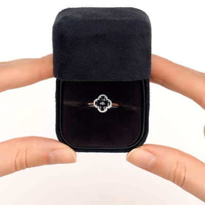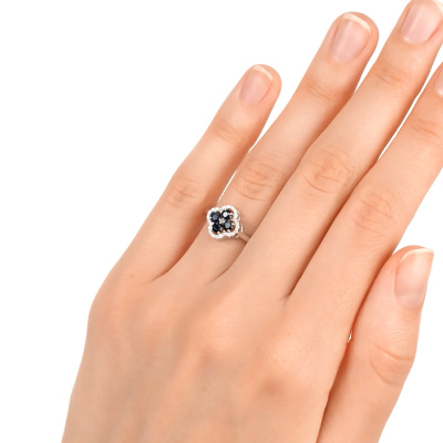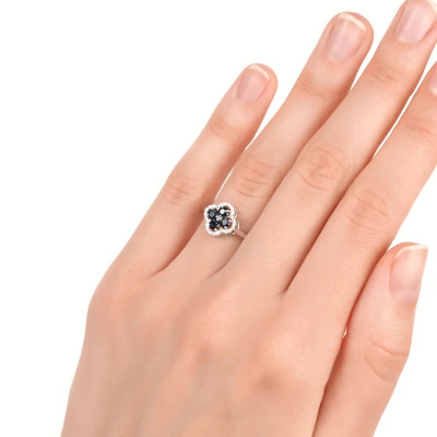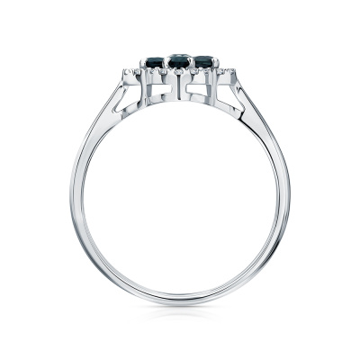 Кольцо с 24 бриллиантами природными, 0.07 карат, огранка круг 17 граней, цвет 2, чистота 2, тип огранки А; 4 сапфирами природными, 0.4 карат, цвет 2, чистота 2, тип огранки В; Белое золото 585 пробы.