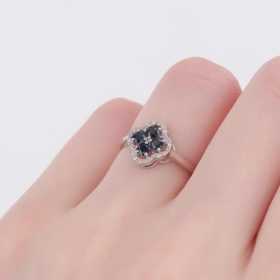 Кольцо с 24 бриллиантами природными, 0.06 карат, огранка круг 17 граней, цвет 2, чистота 2, тип огранки А; 4 сапфирами природными, 0.4 карат, цвет 2, чистота 2, тип огранки В; Белое золото 585 пробы.