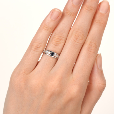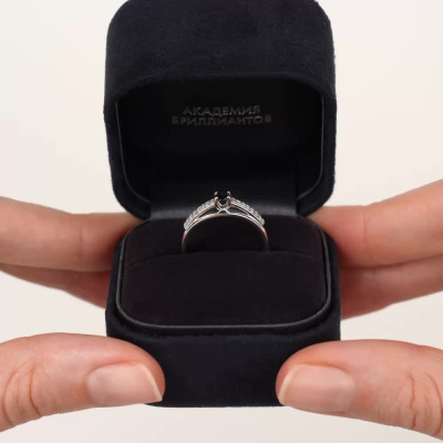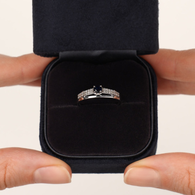 Кольцо с 28 бриллиантами природными, 0.07 карат, огранка круг 17 граней, цвет 2, чистота 2, тип огранки А; 1 сапфиром природным, 0.21 карат, цвет 2, чистота 2, тип огранки В; Белое золото 585 пробы.
