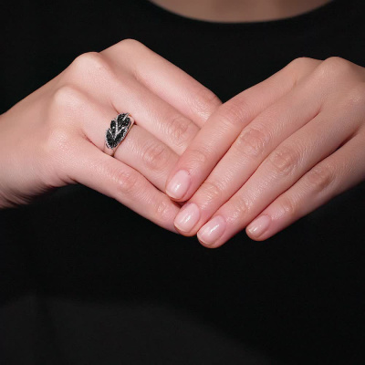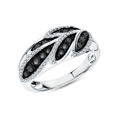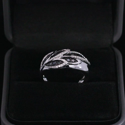Кольцо с 16 бриллиантами черными облагороженными, 0.28 карат, огранка круг 57 граней, цвет 7, чистота 6, тип огранки А; 51 бриллиантом, 0.11 карат, огранка круг 17 граней, цвет 2, чистота 3, тип огранки Б; Белое золото 585 пробы.