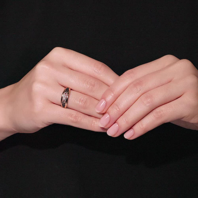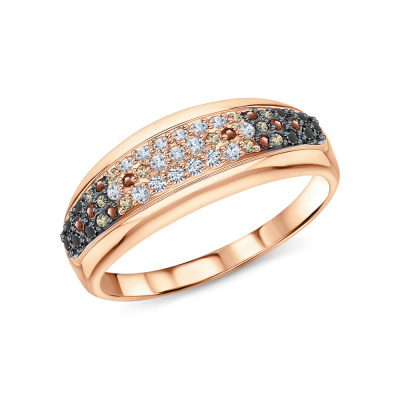 Кольцо с 17 бриллиантами природными, 0.11 карат, огранка круг 17 граней, цвет 2, чистота 2, тип огранки Б; 2 бриллиантами черными природными облагороженными, 0.03 карат, огранка круг 57 граней, цвет 7, чистота 6, тип огранки А; 8 бриллиантами черными природными облагороженными, 0.06 карат, огранка круг 57 граней, цвет 7, чистота 6, тип огранки А; 12 бриллиантами коньячными природными, 0.03 карат, огранка круг 57 граней, цвет 7, чистота 6, тип огранки А; 10 бриллиантами коричневыми природнымиоблагороженными, 0.02 карат, огранка круг 17 граней, цвет 5, чистота 4, тип огранки Б; Розовое золото 585 пробы.