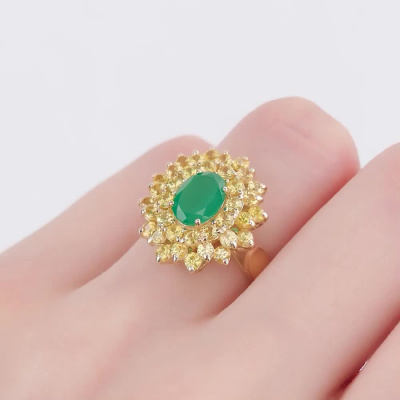 Кольцо с 36 сапфирами желтыми природными, 2.22 карат; 1 агатом зеленым природным; Желтое золото 585 пробы.