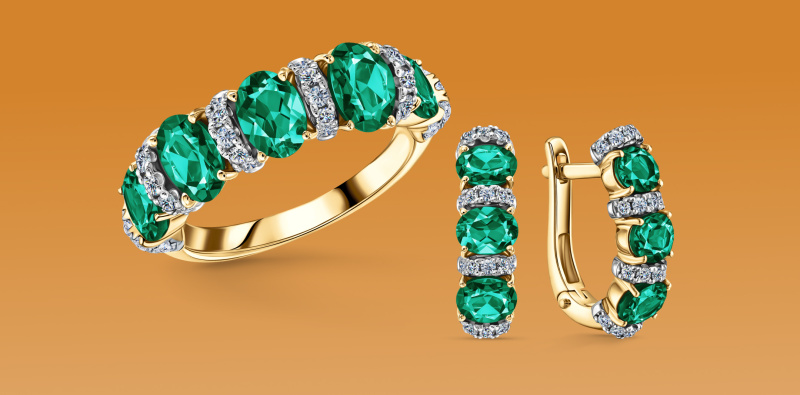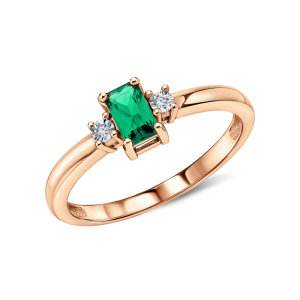Золотое кольцо с бриллиантами выращенными и изумрудами выращенными