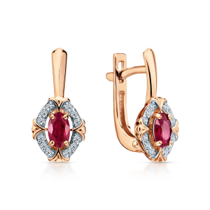 Золотые серьги с бриллиантами природными, гранатами природными и рубинами выращенными